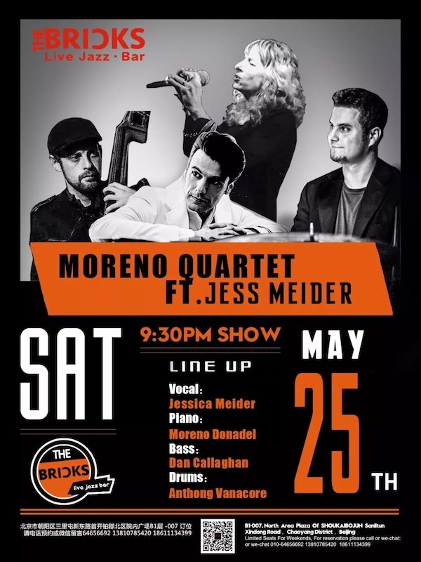One of Beijing’s best jazz vocalists, Jess Meider has spent 20 years gracing stages, festivals and music venues all over China with her amazing voice. She’ll grace the stage at The Bricks tonight alongside Moreno Donadel Trio. FREE