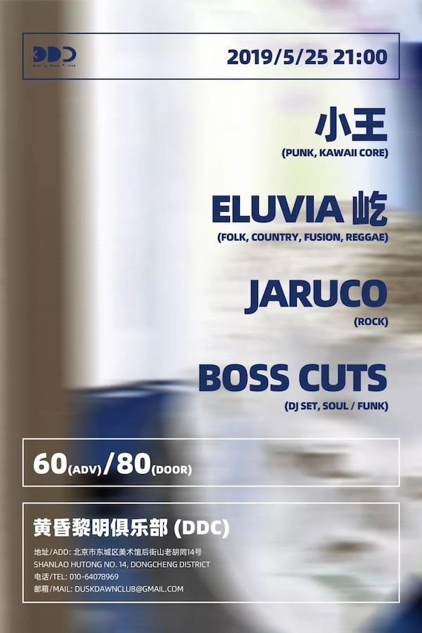 The ever-combustible kawaii core punk favorites Xiao Wang join country-grown fusion reggae group Eluvia and fresh-faced rockers Jaruco for some dirty fun this evening – plus, a special DJ set from soul-funk vinyl spinner Boss Cuts. RMB 80