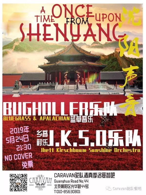 Caravan welcomes two Shenyang bands to their digs for some splendid fun including bluegrass and folk-rock duo Bugholler and The Jhett Kirschbaum Sunshine Orchestra - a rock, blues, and punk duo. FREE
