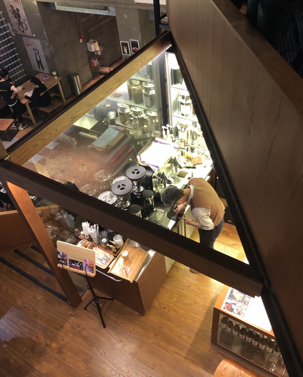 Round the corner and you'll find two smaller platforms, one housing the coffee machine and ordering counter and another where patrons invited to sit at either a pleather bench along the wall, at low tables, or at an island counter with stools in the middle. All the while, avant-grade photos, coffee siphon machines, and jars of beans line the walls.