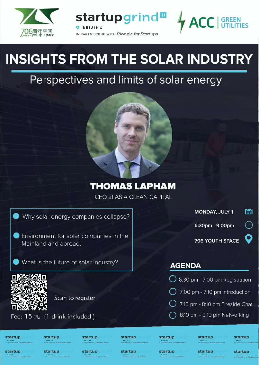 This event hosted by Startup Grind will feature key speaker Thomas Lapham, CEO of Asia Clean Capital, who will share his knowledge and experience in China and Asia's solar industry. The discussion will tackle various perspectives regarding everything from the limits of solar energy, why solar energy companies collapse, the current environment for solar companies in the mainland and abroad, and what the future holds for the renewable energy segment. RMB 15. 6.30-9pm. 706 Youth Space