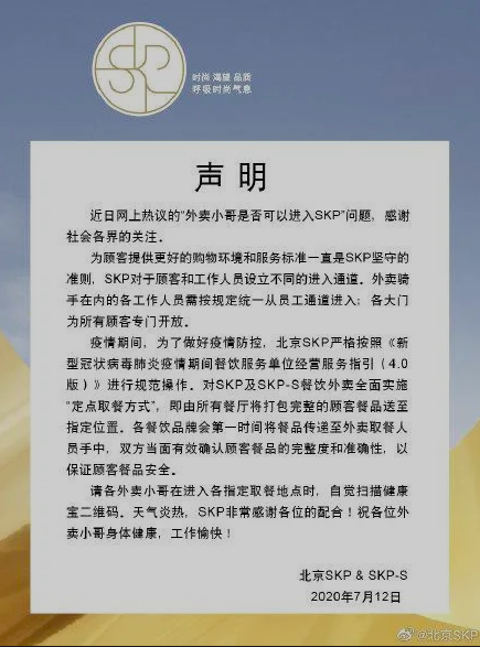 北京SKP昨天贴出回应,表示外卖骑手在内的各工作人员需按规定统一从员工通道进入;商场餐饮外卖全面实施“定点取餐方式”,即由所有餐厅将打包完整的顾客餐品送至指定位置。
