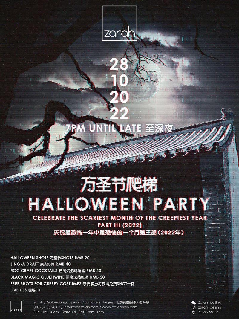 Zarah will be transforming into a haunted house on Oct 28. Expect creepy decorations like bats, ghosts and spiders along with live DJ sets playing spooky tunes to get you in the Halloween spirit. They will have all night specials on their Black Magic Gluehwine (RMB 50), special Halloween Shots (RMB 20) and Jing-A draft beer deal (RMB 40). Turn up in a frightening costume and you’ll also get a free shot on the house.