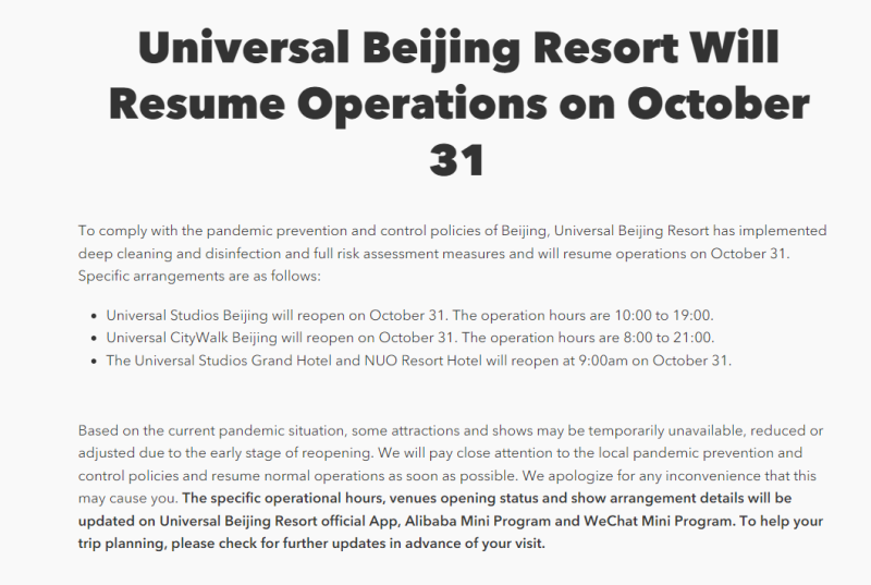 Per the statement, the park says some attractions may be closed or have adjusted capacity and hours for the time being. In order to stay on top of changes, Universal recommends guests check their official app or official Alibaba and WeChat mini programs