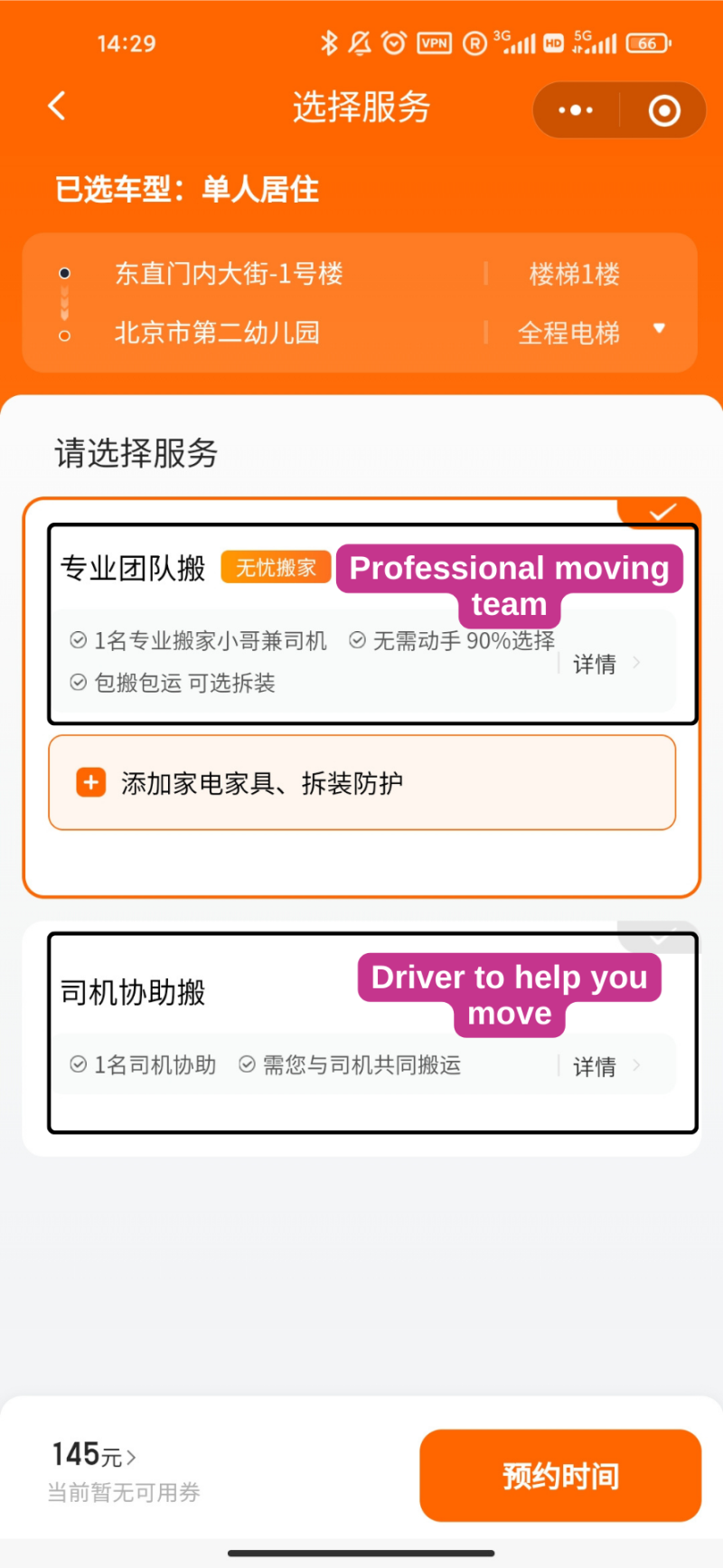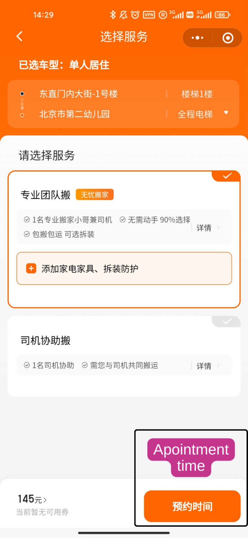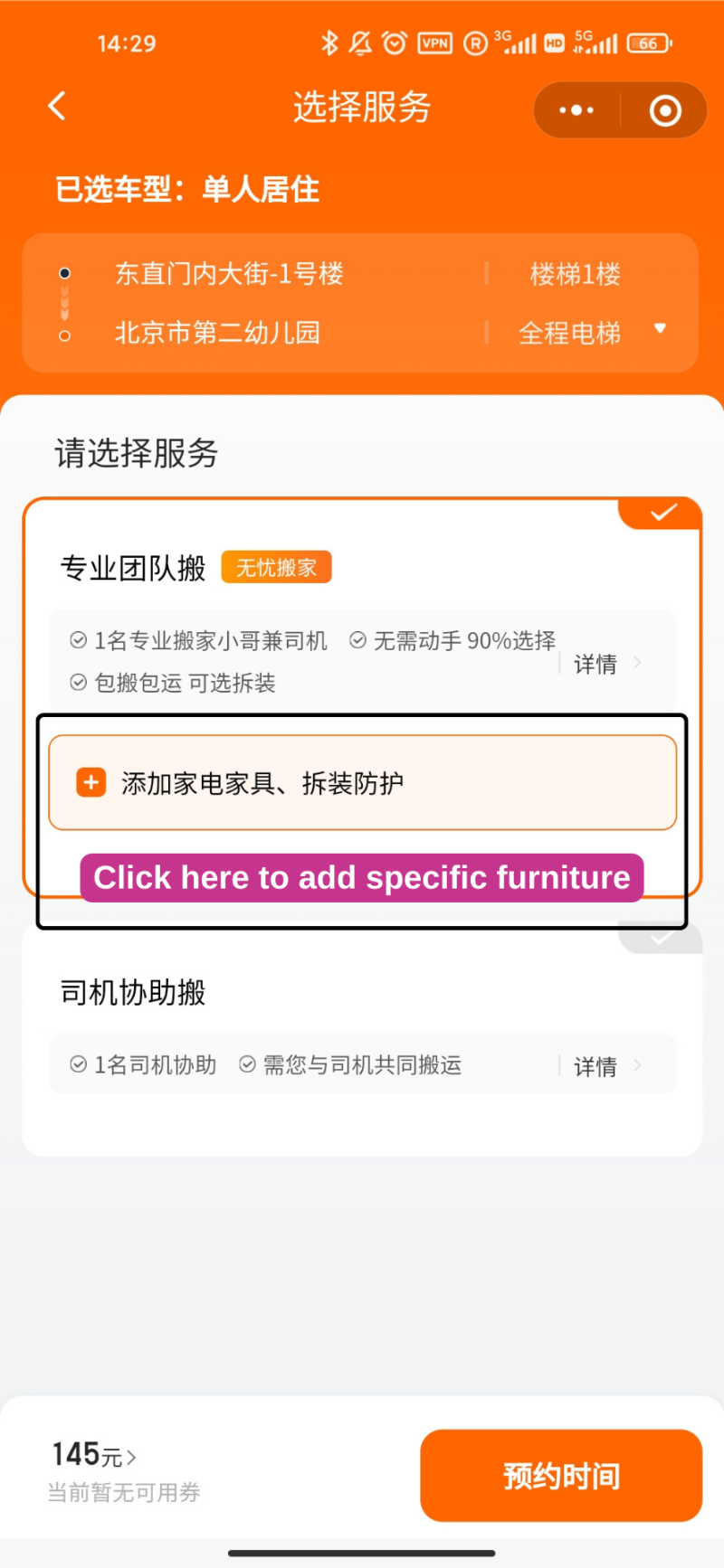Step 14 – Once furniture has been added you need to pick the time and date you want to move. To do so, click 预约时间 yùyuē shíjiān (appointment time).