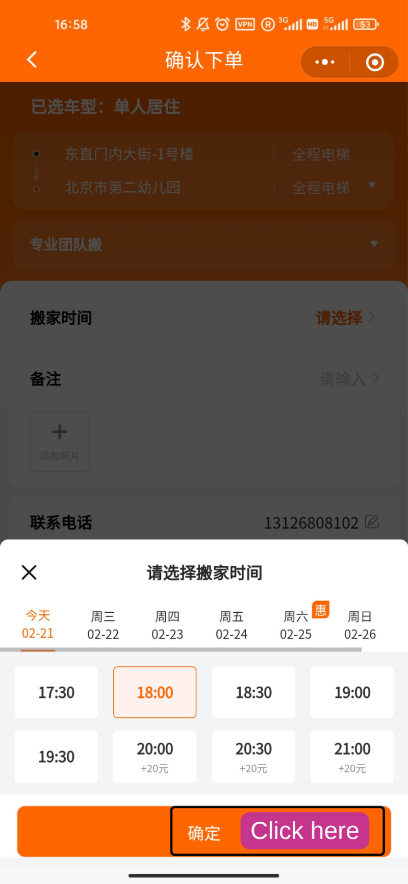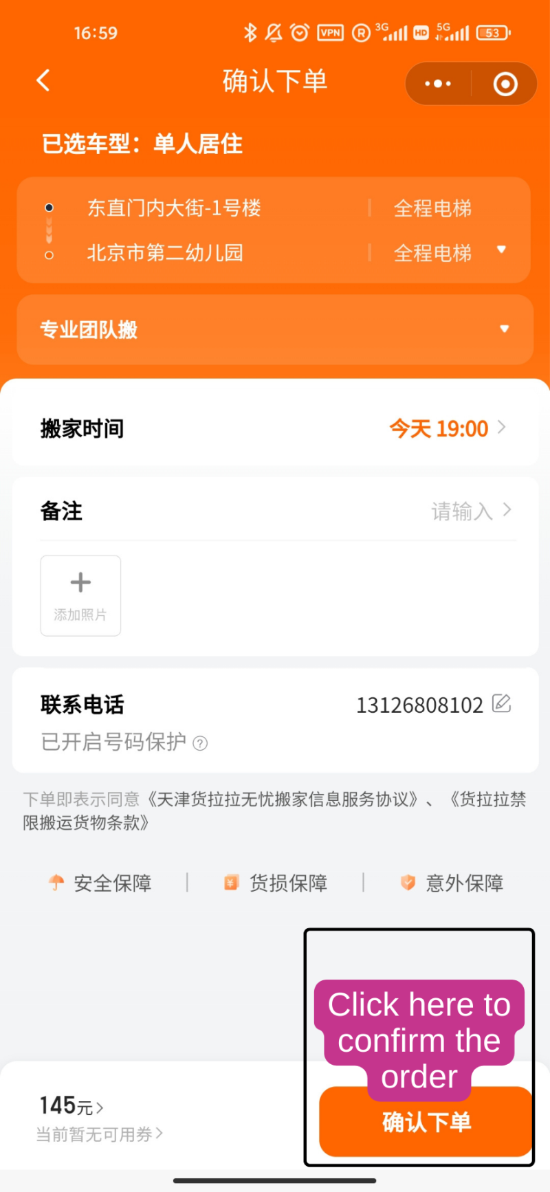 Step 16 – You’ll see a final price at the bottom. To book, click 确认下单 quèrèn xiàdān (confirm order) and you're all set. Note: you don’t pay the fee until after the move has been completed.