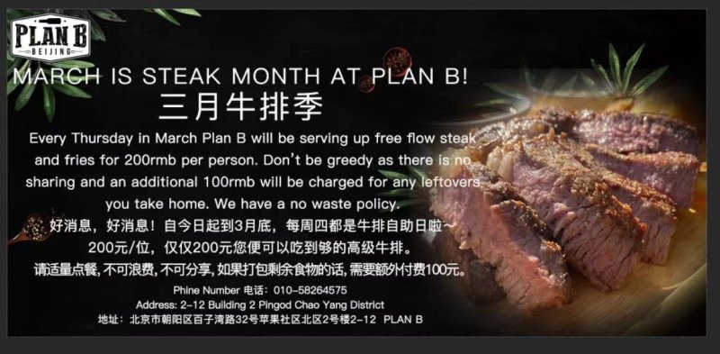 Plan B has launched a special deal for March where every Thursday you can get free flow steak and fries for only RMB 200. The deal features their Australian Angus grain fed steaks and hand cut fries and is a real steal. However, make sure your eyes don’t get too big for your belly because you’ll be charged an additional RMB 100 for any leftovers you take home to ensure a zero-waste policy.