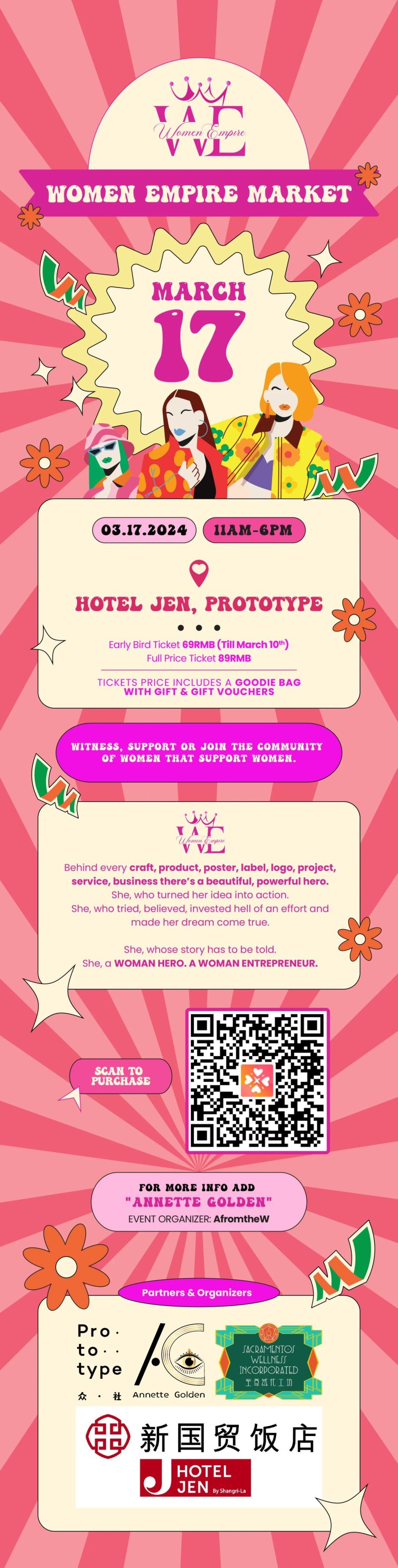 The Women Empire Market will take place at Prototype in JEN Beijing on Sunday, Mar 17 from 11am-6pm, talks from business owners will take place from 2-4.30pm. Tickets are RMB 89 and include a goodie bag with gifts and vouchers, they can be purchased by scanning the QR code in the poster above.