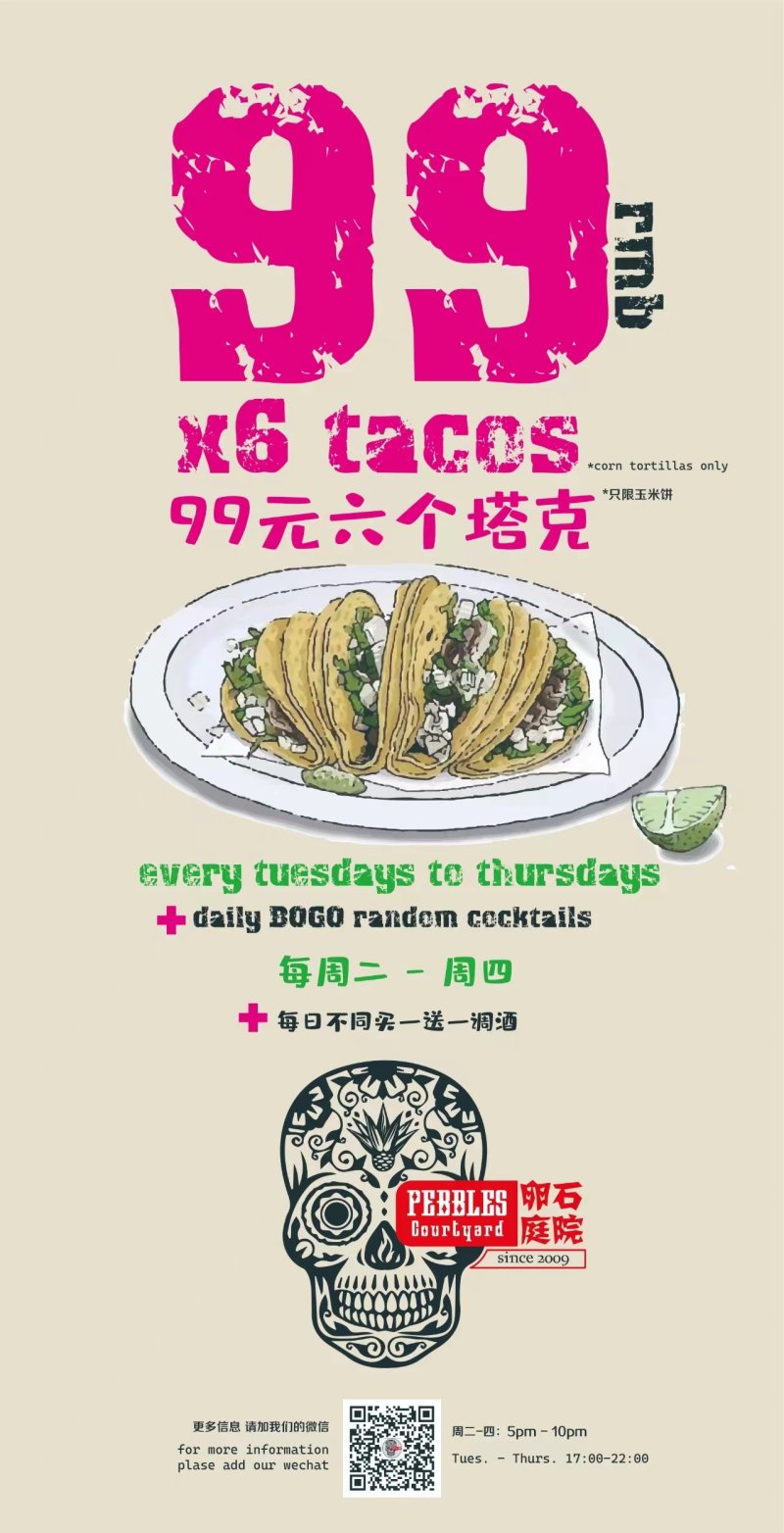 What: RMB 99 x 6 Tacos + Holiday Hours at Pebbles