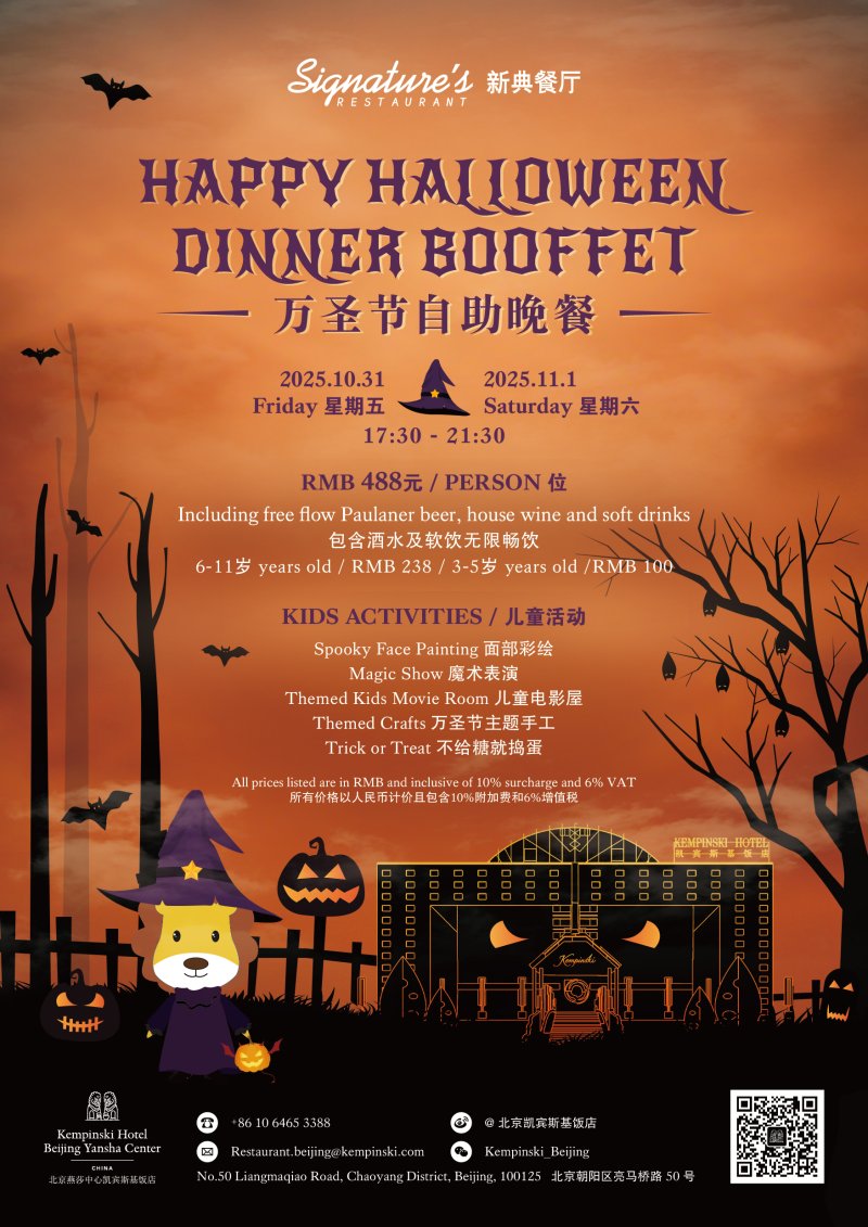 The Kempinski Hotel will be putting on a Halloween “Booffet” dinner and party at Signature's Restaurant on Oct 31 and Nov 1. The buffet includes an array of delicious dishes plus free-flow Paulaner beer, house wine and soft drinks. There will also be plenty of activities to keep the little ones entertained, such as spooky face painting, a clown magic show, a themed kids' playroom and more.
