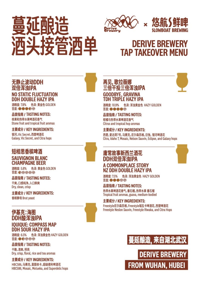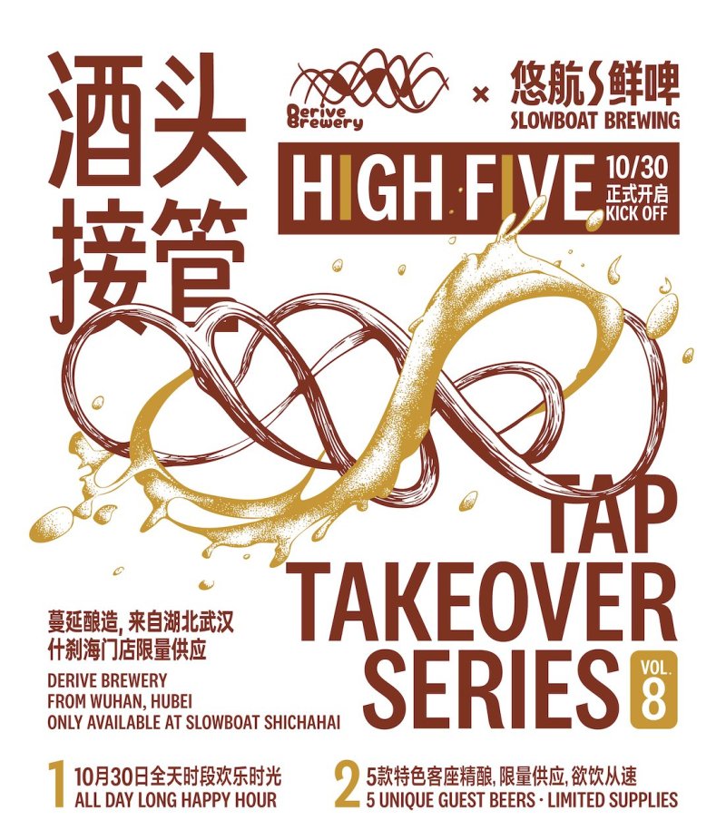 Slowboat’s HIGH FIVE Tap Takeover series returns for its eighth edition with five limited-edition beers from Wuhan’s Derive Brewery, which specializes in classic and new world beers with a focus on clean, innovative brewing. The takeover kicks off on Thursday (Oct 30), with all guest beers RMB 10 all day long. Slowboat will also be unveiling their collaboration brew, Post-West Coast Monkey Fist DDH Double IPA, at the event, so this is one tap takeover you won’t want to miss!
