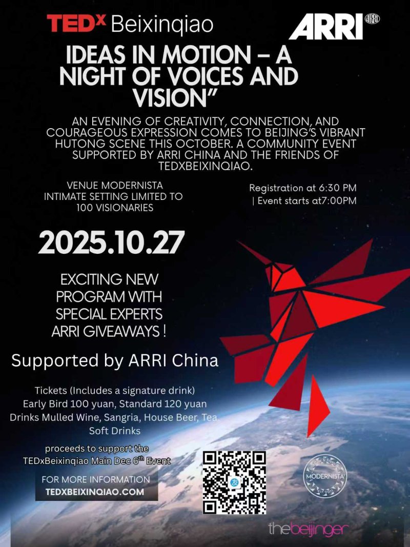TEDx Beixinqiao presents “Ideas in Motion – A Night of Voices and Vision” at Modernista. This exclusive community event, limited to 100 visionaries, promises an evening of creativity, connection and courageous expression tomorrow (Oct 27). Enjoy special speakers, ARRI giveaways and a signature drink.