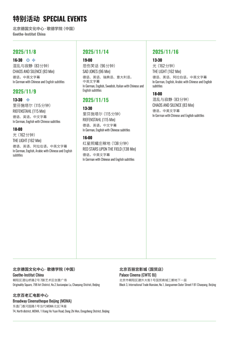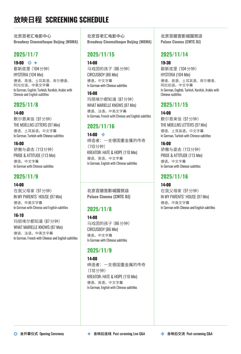 From Nov 7–16, the Festival of German Cinema returns to Beijing with 12 acclaimed films screening at Broadway Cinematheque Beijing (MOMA), Palace Cinema (CWTC), and the Goethe-Institut China. Presented by German Films, alongside the Goethe-Institut China and Broadway Cinemas, with support from the German Embassy and Consulates, the festival offers a curated lineup celebrating the best of contemporary German cinema. Along with film screenings, there are some special events planned as well, like online Q&As and on-site talks. You can see the full schedule in the posters below.