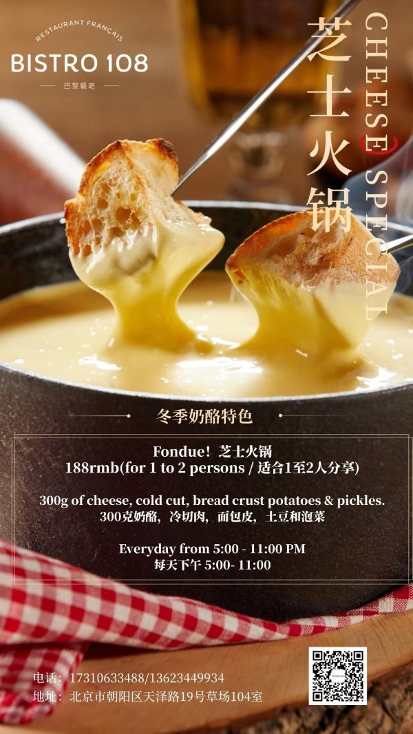 Bistro 108's Cheese Fondue (RMB 188/set for one to two people) has also made a return for the season. Made with 300g of melted cheese, it's accompanied by cold cuts, crusty bread, potatoes and pickles. It's available every day from 5pm to 11pm.
