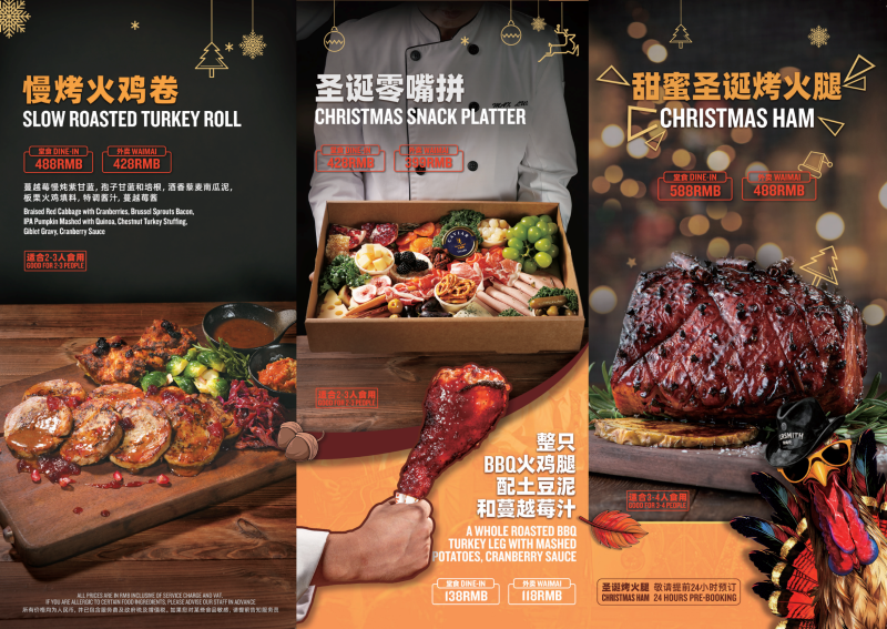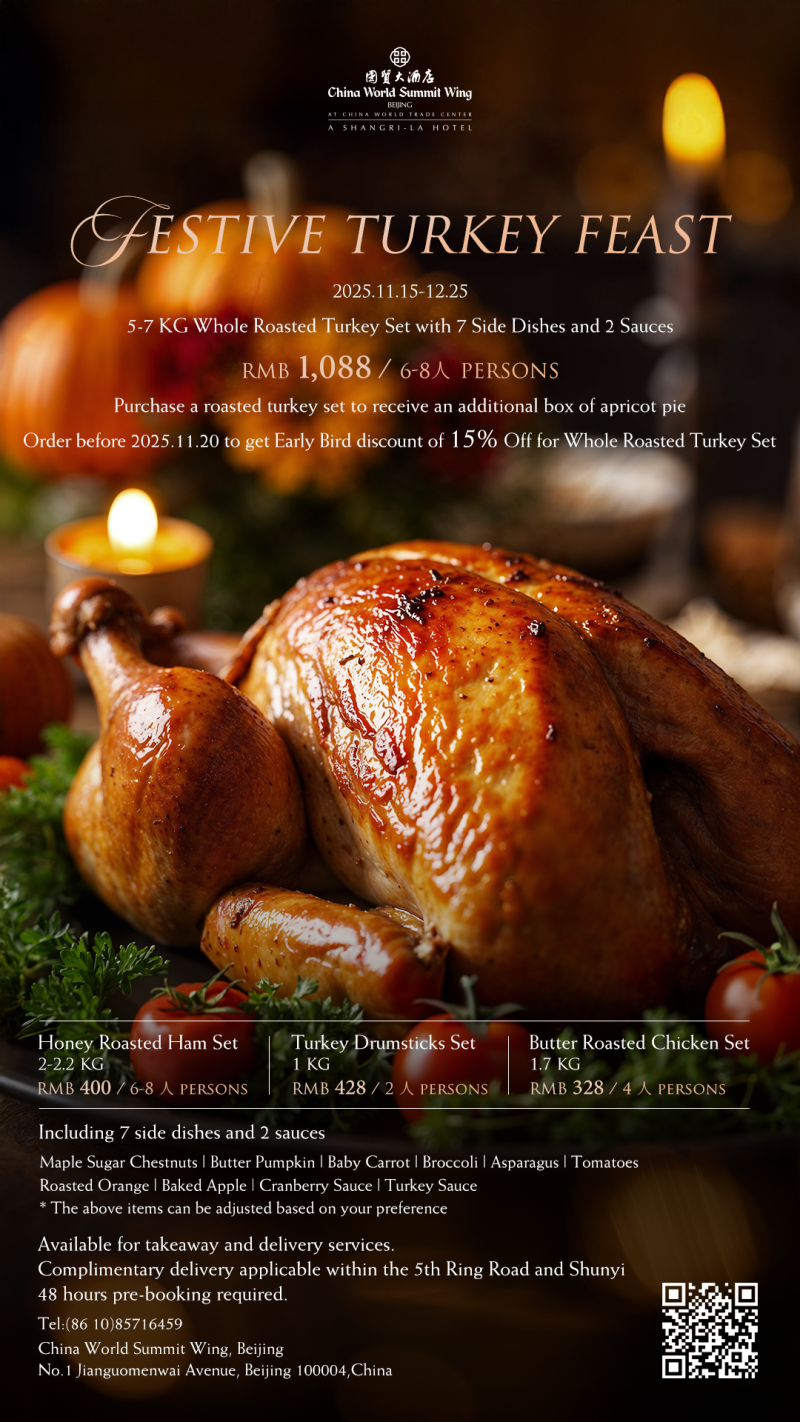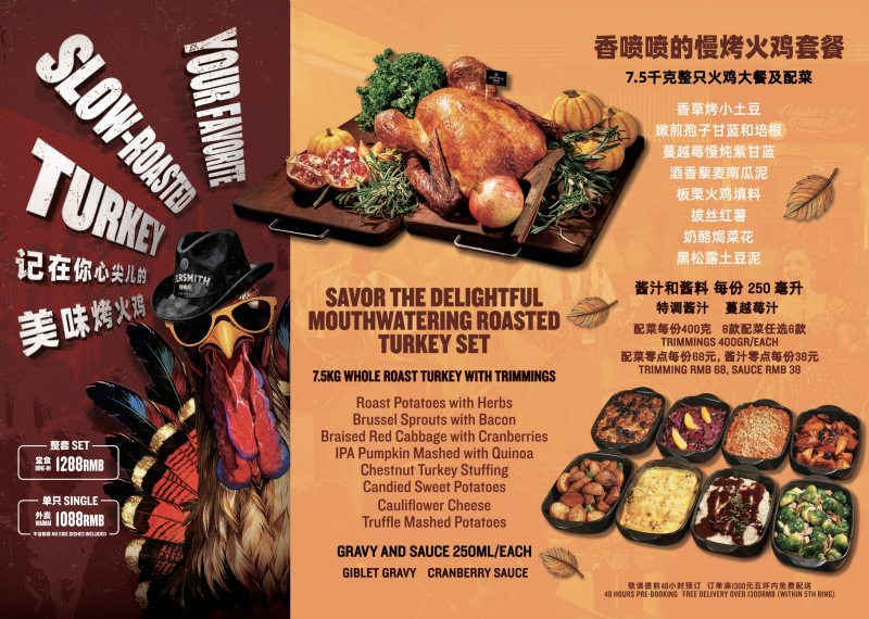 Price: 5-7kg Whole Roasted Turkey Set (RMB 1,088); 2-2.2kg Honey Roasted Ham Set (RMB 400); 1kg Turkey Drumsticks Set (RMB 428); 1.7kg Roast Chicken Set (RMB 328)