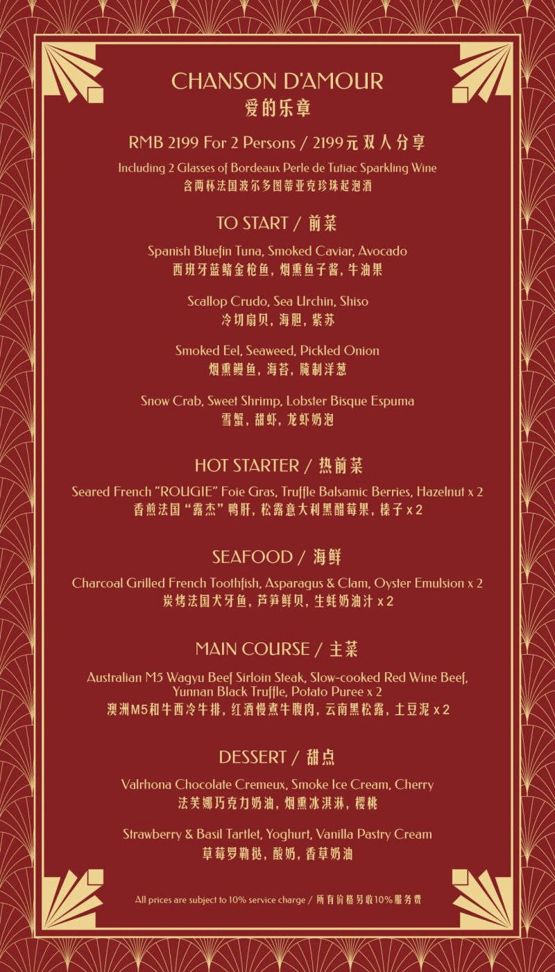 Mandarin Grill at Mandarin Oriental Wangfujing, Beijing will be doing a "Valentine's Night: A Taste of Romance," a special themed dinner crafted exclusively for couples. The restaurant will also offer limited-edition Valentine’s gift boxes. You can see the full menu below.