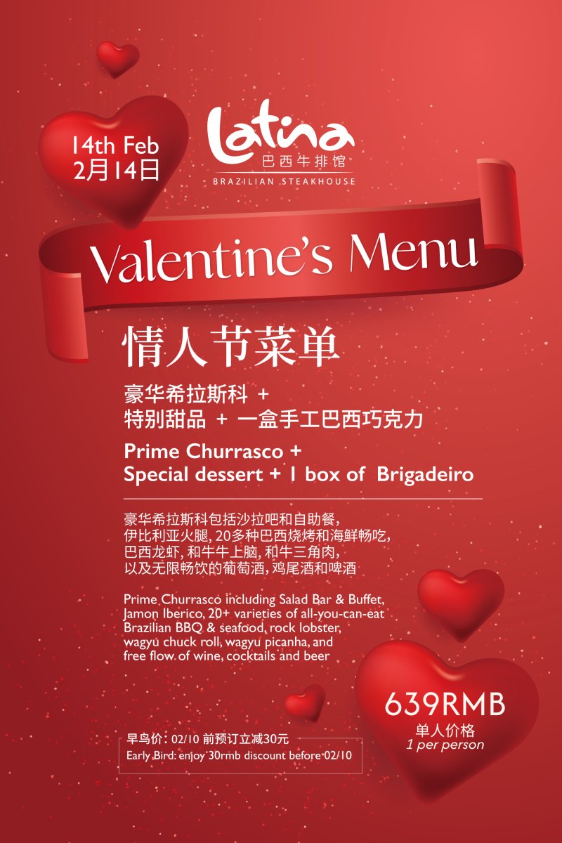 Latina will be offering their Prime Churrasco for Valentine's Day, which includes the salad bar and buffet, Jamon Iberico, all-you-can-eat Brazilian BBQ, seafood, free flow wine, beer and cocktails and more. The dinner also includes a special dessert and one box of Brigadeiro.