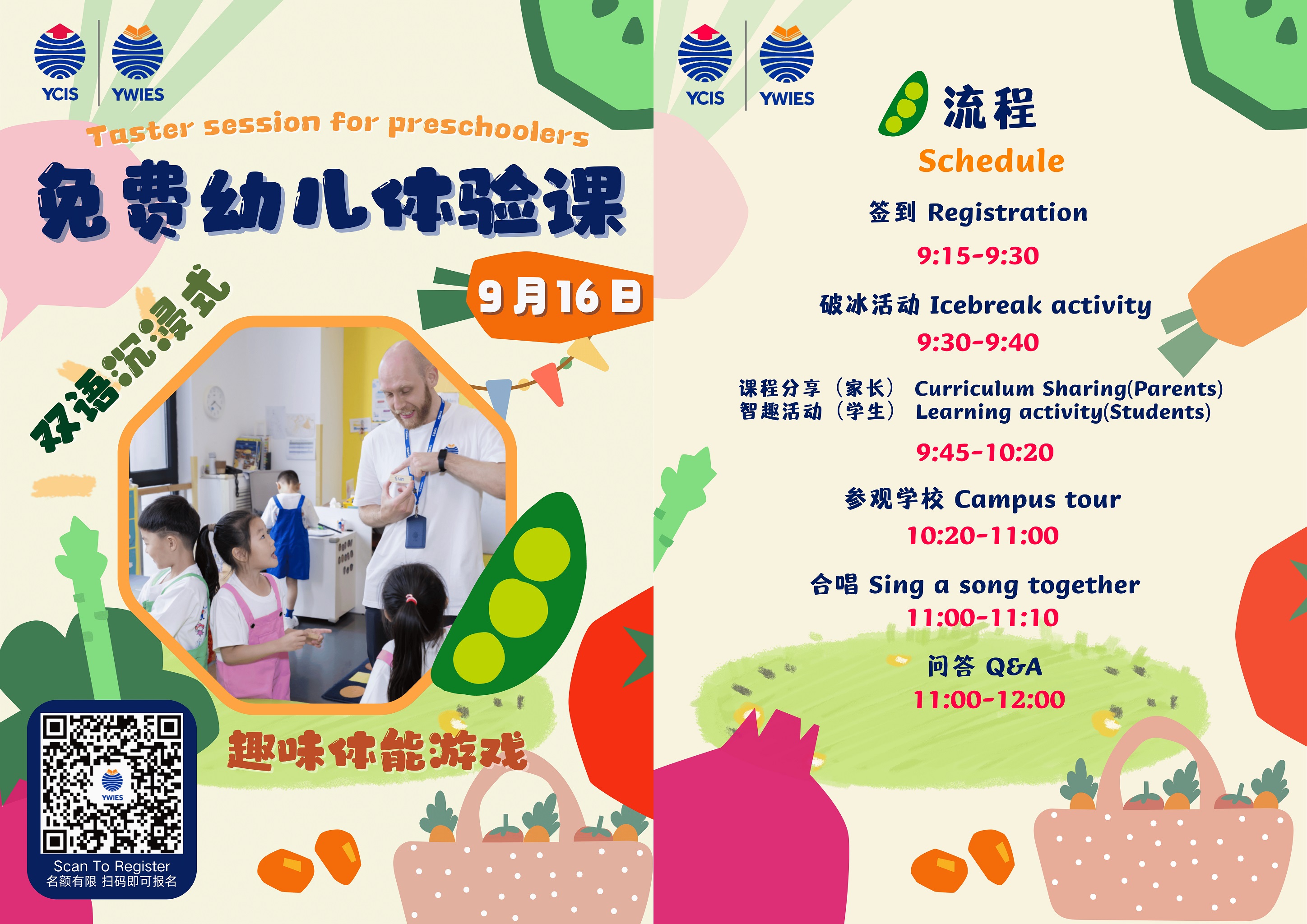 Join YCIS & YWIES on September 16 for a fun Taster Session for preschoolers! Experience a bilingual immersive program with engaging activities, curriculum sharing for parents, learning games for children, a campus tour, and a joyful group sing-along. Don’t miss this chance to explore our vibrant community. Register easily by scanning the QR code today!