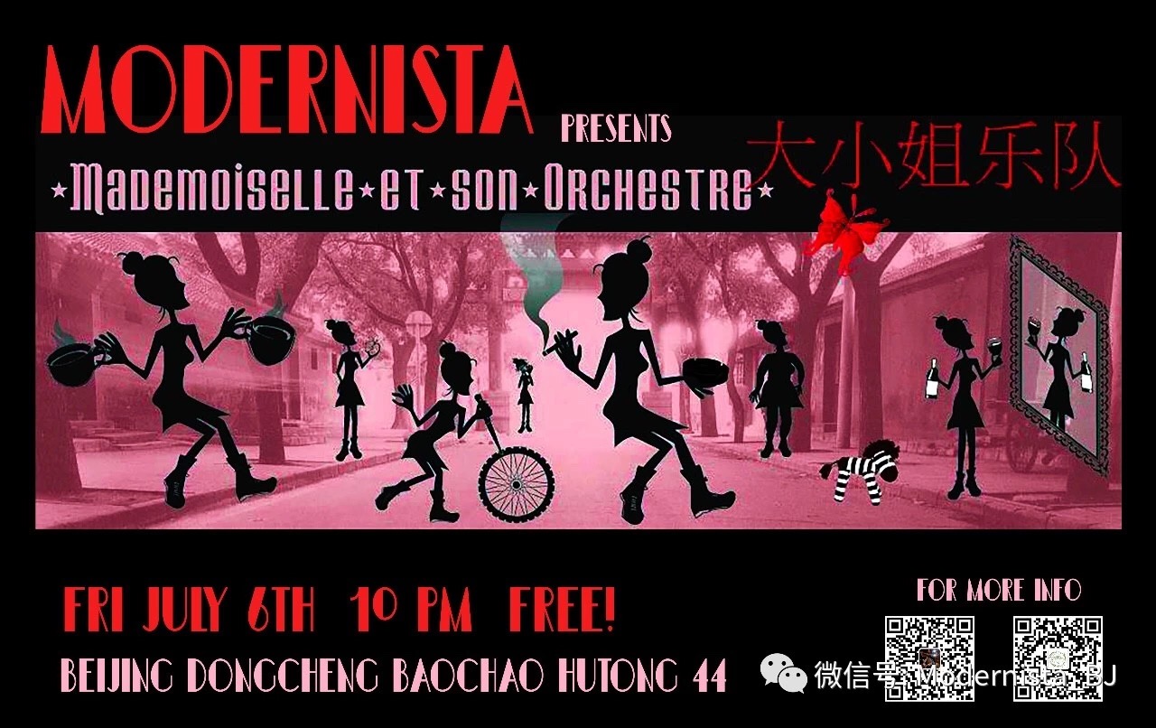 One of the fav Beijing based bands MADEMOISELLE ET SON ORCHESTRE - will have a last summer gig at Modernista! This six piece band based in Beijing - is again with us for a proper music bash! They are the only group in China offering a unique repertoire of French songs. The band has played since 2004 throughout China in many events for the promotion of French culture. Their music is party inspired by Gypsy Jazz: a style invented in France in the 1930s by Stefan Rappelli and Django Reinhardt. Using the Gypsy Jazz style, Mademoiselle et son Orchestre re-invents the classic songs by Piaf, Brassens, Gainsbourg, and many others. Their own tunes are spiced with humours and imaginative lyrics, which bring the audience into the surreal dream world of Mademoiselle ...