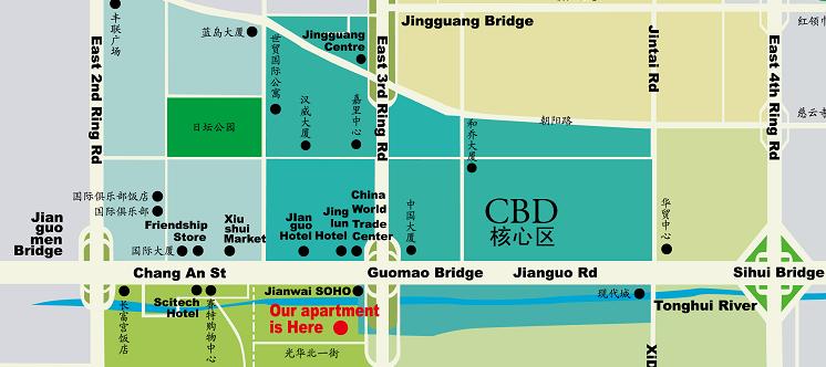 65 square meters, facing south, located in the south-west of Guomao Bridge, 5 minutes' walk to the East 3rd Ring Road, 10 minutes' walk to Jianwai Soho, Metro 10 Shuangjing Station or Metro 7 Guangqumenwai Station. 13th of 14-storey, wooden floor, modern-decorated, fully furnished with IKEA furniture, TV set, refrigerator, washing machine, air-conditioner and water heater. Internet and 24-hour elevator available. Easy shopping and eating-out with lots of supermarkets, 24-hours mini marts, groceries, restaurants, bars, banks, bakeries, pharmacies and laundries around.