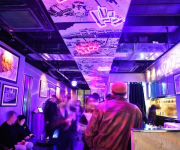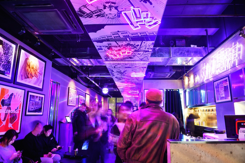 Hidden behind a row of vending machines, the neon lit bar is stocked with draft cocktails and retro video game consoles.