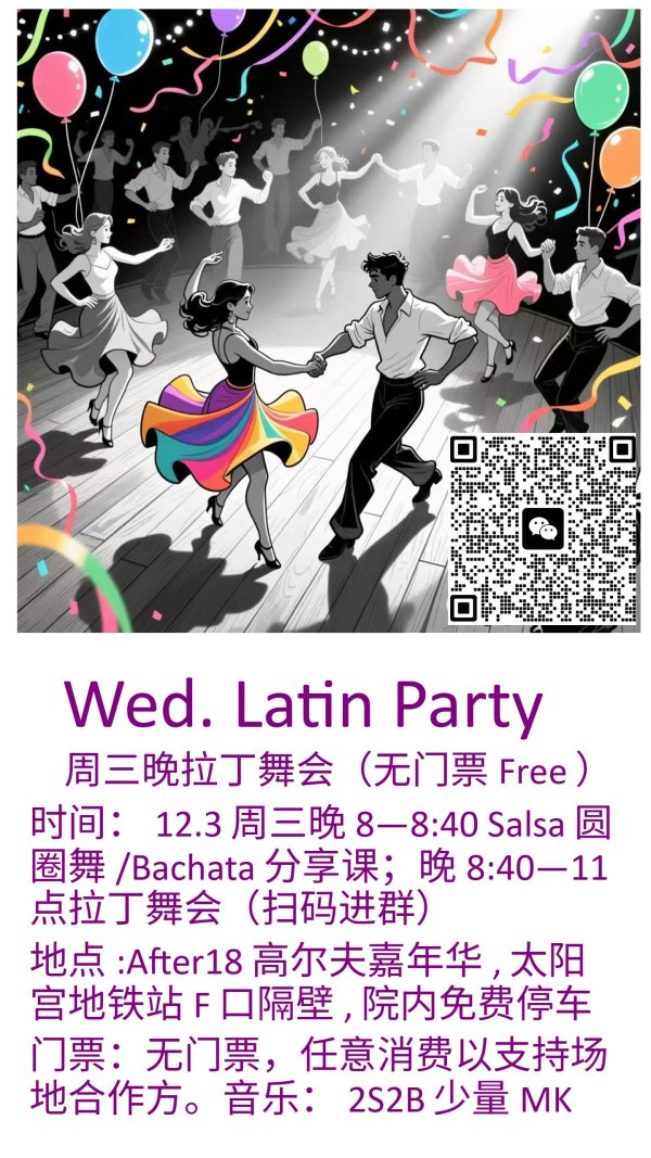Dec 03 08:00 pm - 11:00 pmWhere: Taiyanggong ParkWed. Latin Party (Free Entry) Time: Dec.3 Wed. 8-8:40pm Salsa/Bachata public class 8:40-11pm Latin Party Venue: After 18 (高尔夫嘉年华), Free parking Ticket: Free entry, buy drink or food to support venue provider. Music: 2Salsa 2Bachata and others. Join: scan QR code to...Is it free? It's free