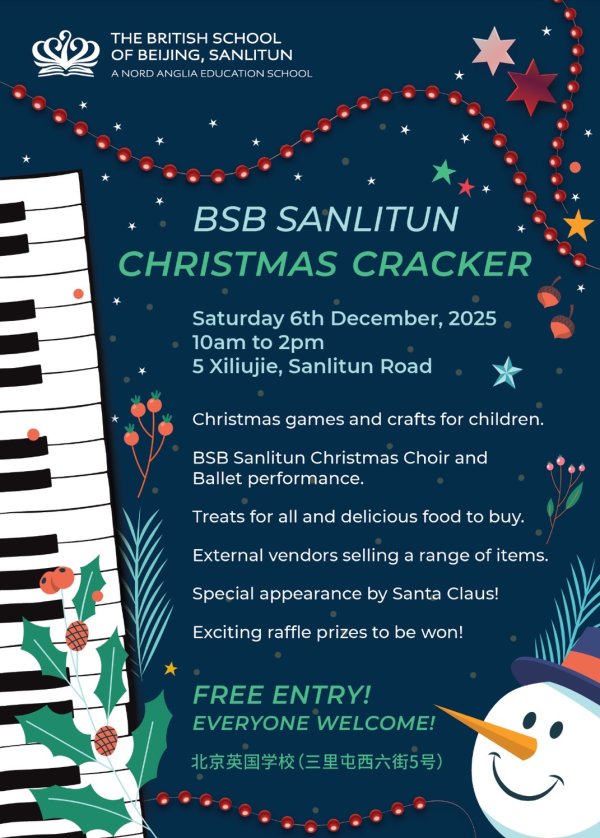 Get festive with the BSB Sanlitun Christmas Cracker event! This community market and celebration features treats and delicious food to buy, external vendors selling a range of items, exciting raffle prizes, and a special appearance by Santa Claus. Enjoy a performance from the BSB Sanlitun Christmas...
