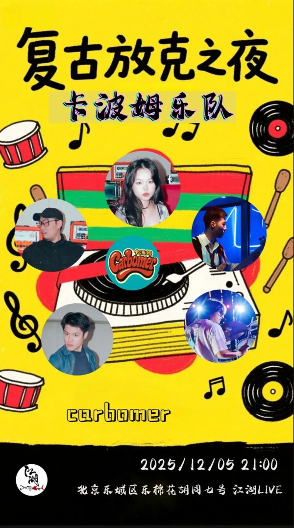 Get your groove on at 'Retro Funk Night' with the Carboomer Band! They are ready to bring the funk to Jianghu LIVE on Friday night at 9:00 PM. The vibrant, retro-inspired poster promises a high-energy, danceable music event perfect for a fun night out in Beijing. (复古放克之夜 卡波姆乐队)