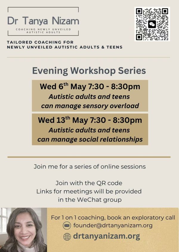May 06 07:30 pm - 08:30 pmDr. Tanya Nizam hosts an insightful evening workshop series (线上研讨会) tailored for newly unveiled autistic adults and teens. These online sessions focus on practical life skills, covering sensory overload management on May 6th and social relationship strategies on May 13th. Join via the provided QR...Is it free? Not freeFamily Friendly Event