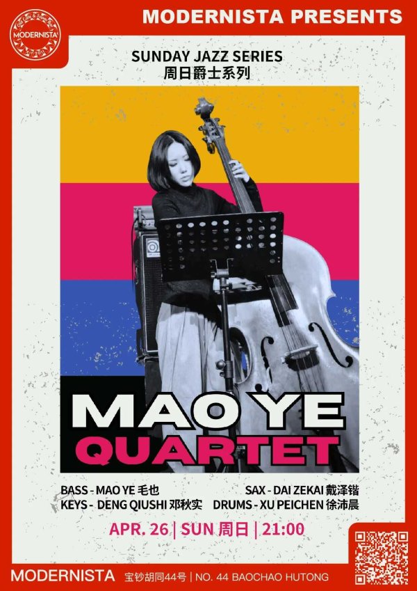 Apr 26 09:00 pm - 11:00 pmCap off your weekend with the Sunday Jazz Series (周日爵士系列) at Modernista, featuring the Mao Ye Quartet (毛也四重奏). Enjoy a sophisticated evening of live jazz with Mao Ye on bass, Dai Zekai on sax, Deng Qiushi on keys, and Xu Peichen on drums in a classic Hutong setting.More Info: No. 44 Baochao HutongIs it free? Not free