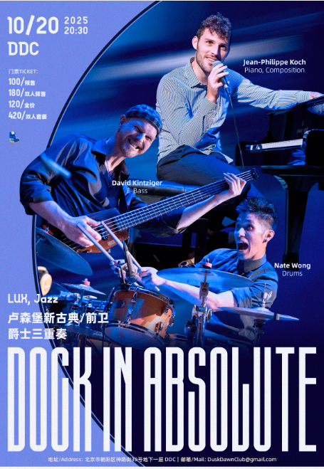 Oct 20 08:00 pm - 11:00 pmWhere: DDC (Dusk Dawn Club)Dock In Absolute is a young and talented 3-piece band hailing from Luxembourg. With many years of experience, they have established themselves as a staple in the local Jazz music scene, known for their unique blend of Progressive Rock Jazz or Neo Jazz with piano, electric bass and drums.Is it free? Not freePrice: RMB 100