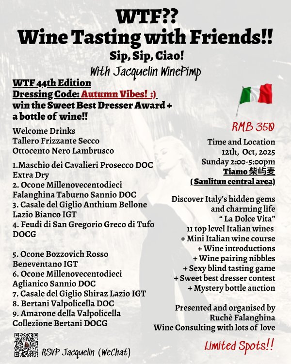 Oct 11 02:00 pm - 05:00 pmWTF?? Wine Tasting with Friends!! Our first Italian wine event of autumn is finally here. We’re ready to sip, laugh and connect. Mark your calendar for Oct 12, 2:00-5:00 PM and join us at Tiamo (Sanlitun central area) for an unforgettable afternoon. More details clink this link to read article from...Is it free? Not freePrice: 350