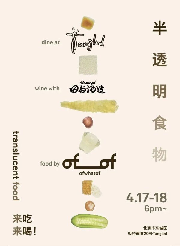 Experience a unique culinary collaboration featuring 'Translucent Food' (半透明食物) at Tangled. This artistic dining event pairs innovative dishes by 'of what of' with curated wine selections by 'Tinnyu'. Located in the heart of Dongcheng, it's a minimalist, sensory-focused evening perfect for foodies...