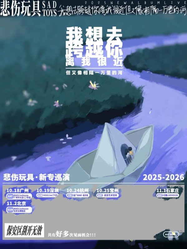 Catch SAD TOYS on their 2025 New Album Tour, '我想去跨越你离我很近但又像相隔一万里的河' (I want to cross the river that's close to me but seems a thousand miles away)! Known for their emotional, alternative sound, this is your chance to hear new tracks live. The Beijing stop takes place at MAO Livehouse-don't miss...