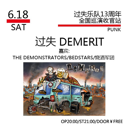 Opening the show are friends of Demerit, fellow punks, and three of the most entertaining bands in the city. After releasing their debut album and touring throughout China last year, Bedstars are battle tested and never fail to deliver. "Punk with Chinese characteristics" trio the Shochu Legion write old-school Motorhead inspired punk tunes in a way that can win over any audience. The Demonstrators only formed a couple years ago but is made up of members of the Beijing punk scene who have bounced around different bands over the years; The Demonstrators write aggressive punk anthems and they have already developed a large following.