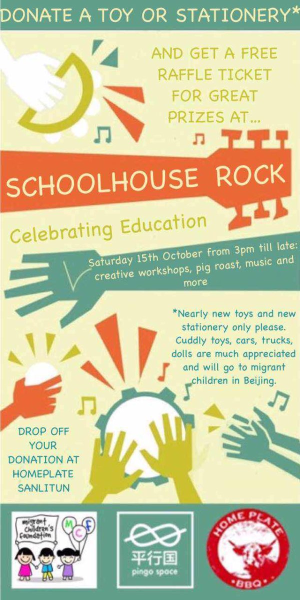 Migrant Children’s Foundation (MCF), Pingo Space, and Home Plate BBQ value education and its role in the community. In order to celebrate that as well as support an organization whose goal is to improve the quality of education, resources, and healthcare for migrant children and their families in Beijing, we came together to organize School House Rock - an event that will be fun for everyone involved and everyone that attends!!