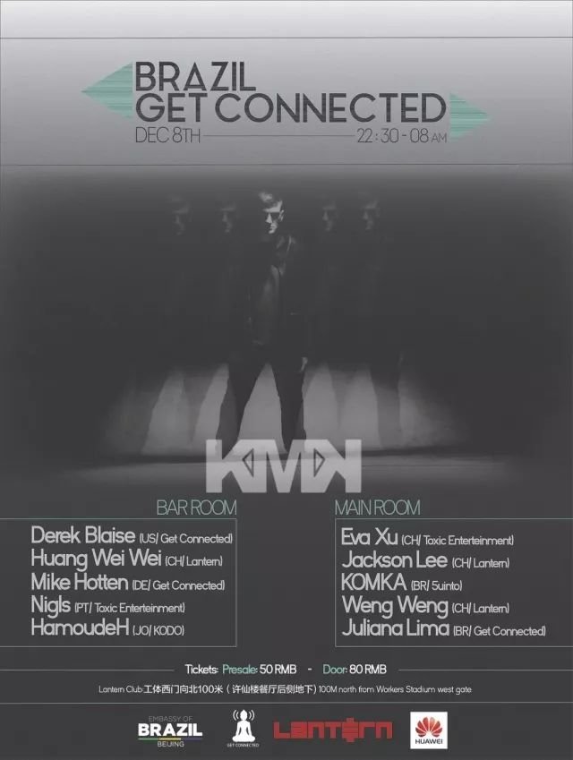 The promoters say: "Brazil Get Connected is an association between Get Connected and the Embassy of Brazil in Beijing. The association now aims at showcasing the vibrancy of Brazilian electronic sounds in China. DJ Komka Asia Tour is our first try, but we believe first impressions count and we’re definitely coming in strong. Get ready for some serious Brazilian electronic music, because it’s beyond your imagination."