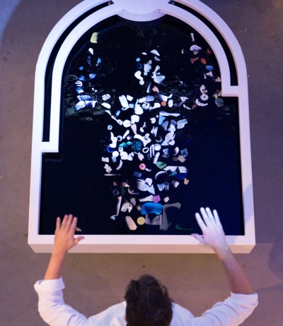 The 2017 Lumen Prize Gold Award was awarded to Plastic Reflectic an interactive mirrored installation, created by Dutch artist Thijs Biersteker in collaboration with The Plastic Soup Foundation. The installation is made up of 601 pieces of plastic waste collected from oceans in different parts of the world. In Biersteker’s work, when audiences approach a dark pond of water, where plastic debris is floating, the waste will appear and form silhouettes in accordance with their postures. The installation brings plastic waste that was once cast out to sea to the feet of the spectator, compelling them to rethink the reciprocal relationship between humans and nature.