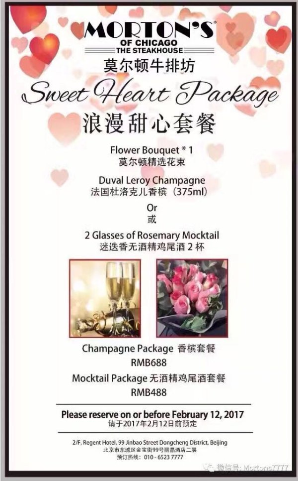 They are also offering a "Sweet Heart Package" including a bouquet of flowers and a half bottle of Duval Leroy Champagne for RMB 688 (pre-order before February 12).