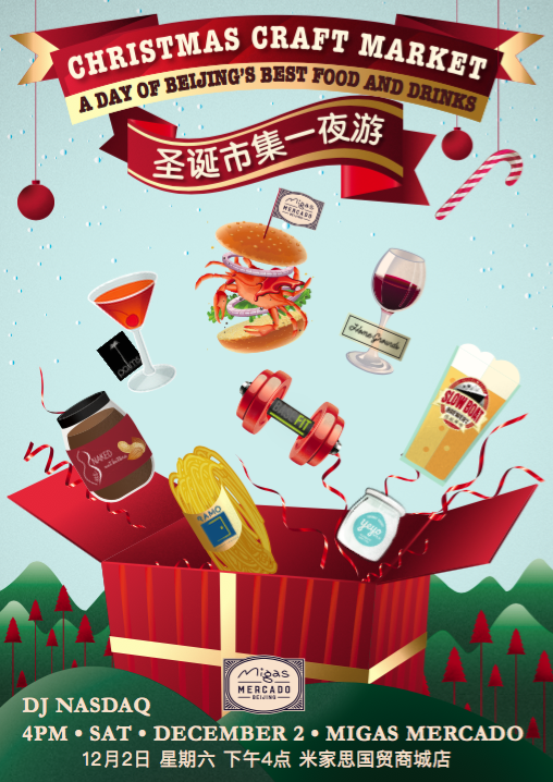 On Saturday, December 2nd, beginning at 4PM, come join us at Migas Mercado for mulled wine, baked goods, fresh food, lucky draws, fitness challenges, DJ Nasdaq, and the best of Beijing’s craft product scene. The full schedule of events is below: