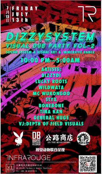 Two Beijing based Reggae labels DIZZYSYSTEM & DBBROS, plus two sub-cultural IP joint and PLAYBOY bring you visual art combined with immersive dance at Infrarouge this Friday, July 13th. Capture your sensory experience at the top floor party with signature Infrarouge style.