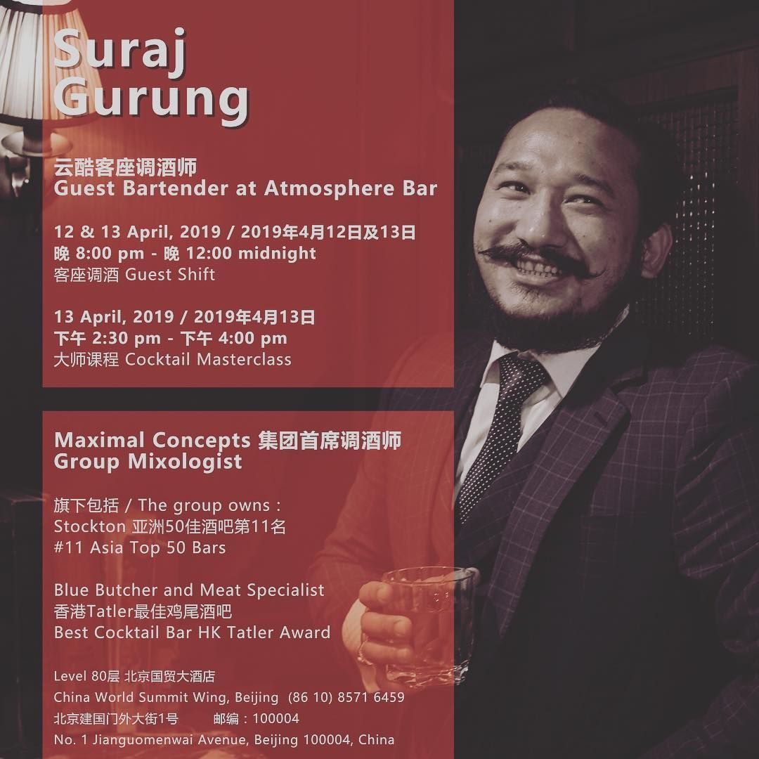 Maximal Concepts Group mixologist Suraj Gurung bellies up to the bar at Atmosphere for a guest shift Friday, April 12th and Saturday, April 13th. Maximal Concepts owns Stockton, Asia’s #11 in Asia’s 50 Top Bars, and Blue Butcher and Meat Specialist, which won the Best Cocktail Bar HK Tatler Award. See what he mixes up for you from 8pm to midnight.