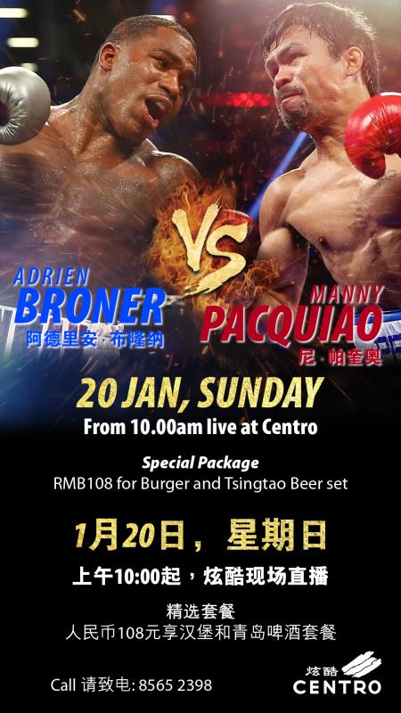 CBD bar Centro at the Kerry Center hotel, will also be showing the fight. They'll be open at 10am, and throughout the morning they'll have a discount on burgers and Tsingdao beers, RMB 108 getting you one of each.