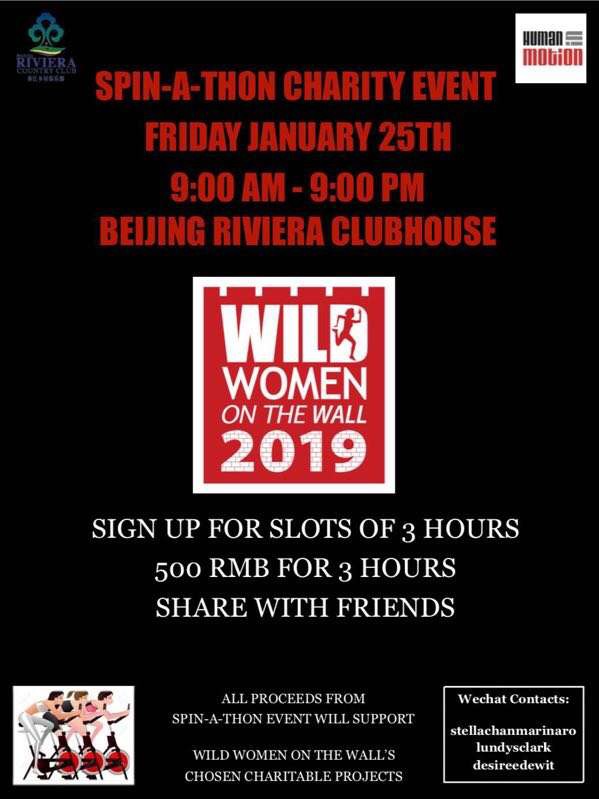 Join the Wild Women of Beijing and spin for charity this Friday! The spin-a-thon runs from 9am to 9pm at the Beijing Riviera Clubhouse. Sign up for a three-hour slot (which may be shared with friends) and support Roundabout, 5 Loaves & 2 Fish House and Agape Family Life House.