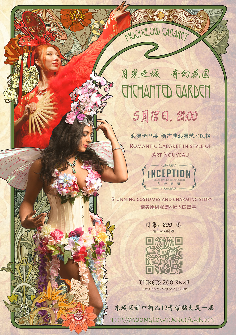 On May 18th Moonglow Burlesque troupe puts on a full-scale production of the "Enchanted Garden" cabaret at an opulent cocktail bar "Inception": five sets, each ~12 min long, with a total running show time of one hour!