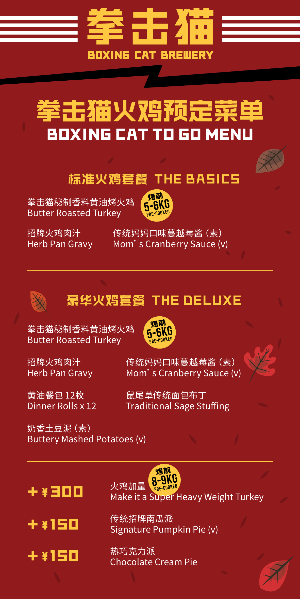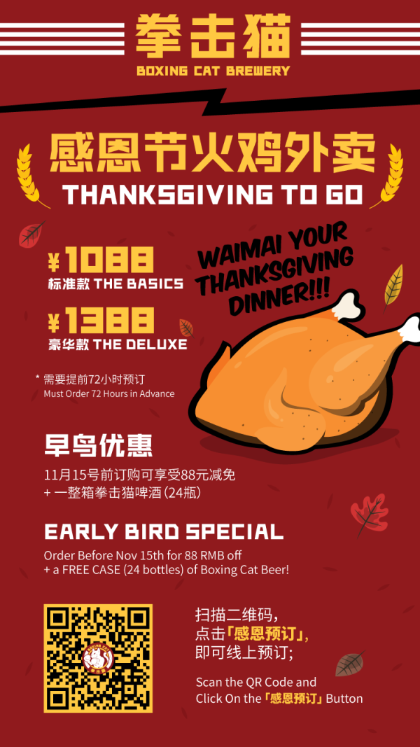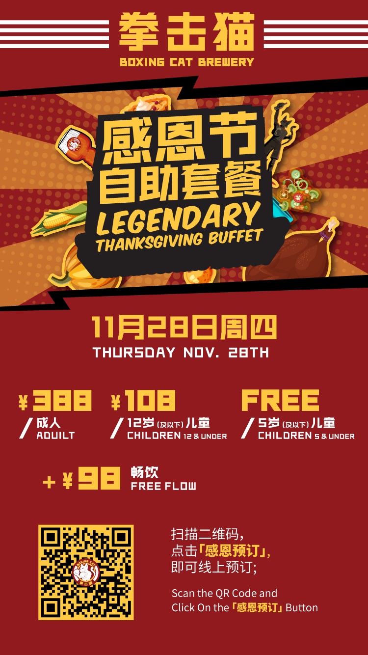On Thursday, November 28th at Boxing Cat Beijing location, we are busting out the whole damn spread, all-you-can-eat buffet-style, accompanied by free-flow for the true sinners out there.There are 2 seatings (5:00 and 8:00) and seats usually fill up fast, so grab your friends and loved ones and book your seats now.