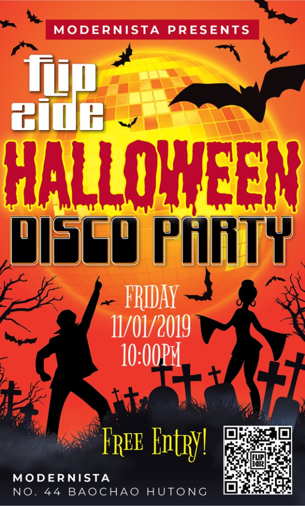 Fabulous witches, dancing skeletons and drinking clowns will all gather around Modernista this Friday for another scary yet sparkly Halloween!! As Flip side summons the spirits of Beijing with their 70s disco tunes, let's dance, drink and celebrate!