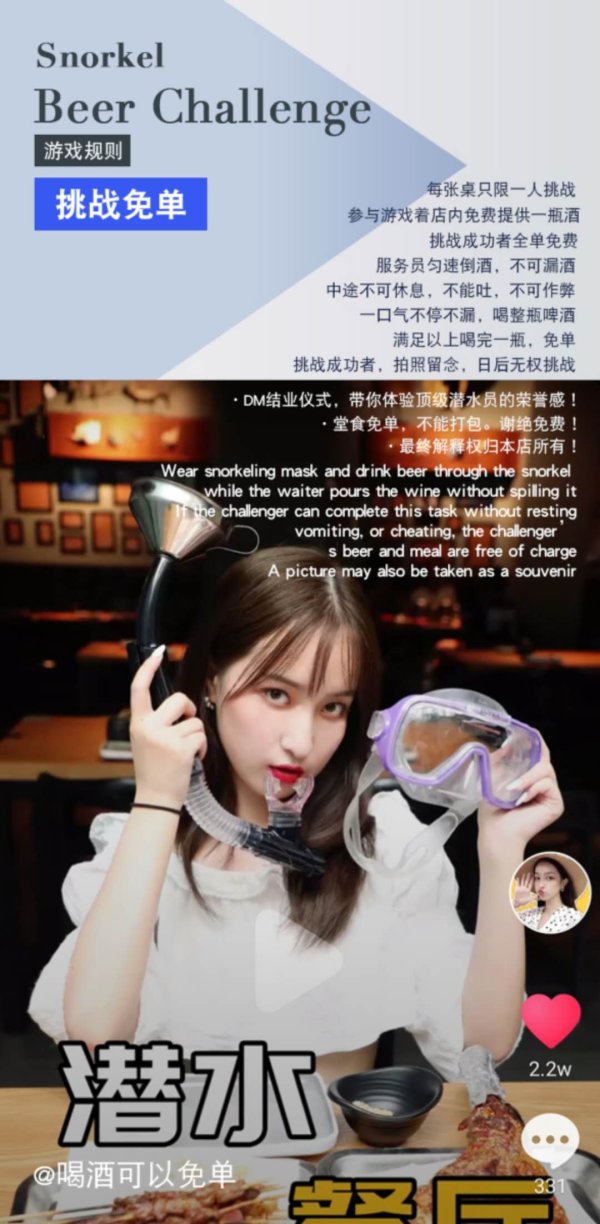 Wear snorkeling mask and drink beer through the snorkel while the waiter pours the beer without spilling it. If the challenger can complete this task without resting, vomiting, or cheating, the challenger’s beer and meal are free of charge. A picture may also be taken as a souvenir.