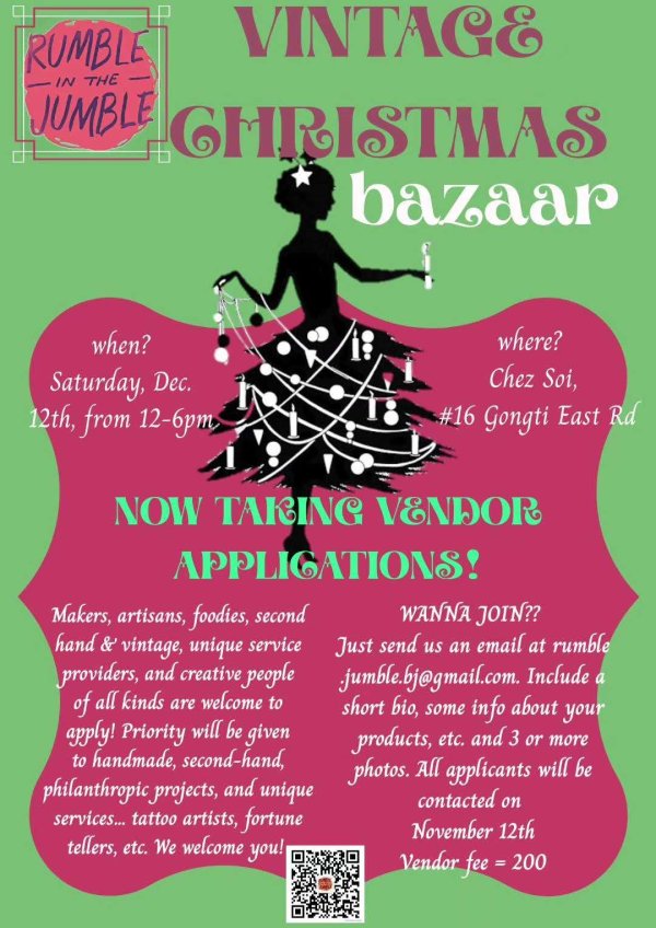 If you want to join us as a vendor, send us an application by email at rumble.jumble.bj@gmail.com. Include a bio, 3 or more photos, and your wechat ID.