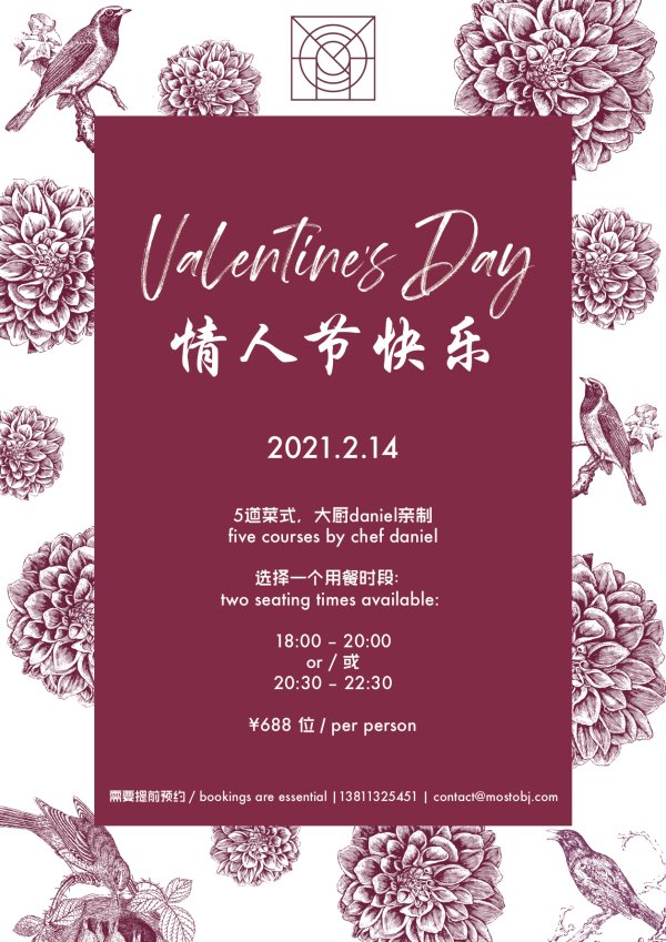 Mosto will have two seatings for Valentine’s Day dinner: 18:00-20:00 or 20:30-22:30. The set menu is ¥688 per person and booking is required. Adjustments can be made for specialty diets upon advance request.